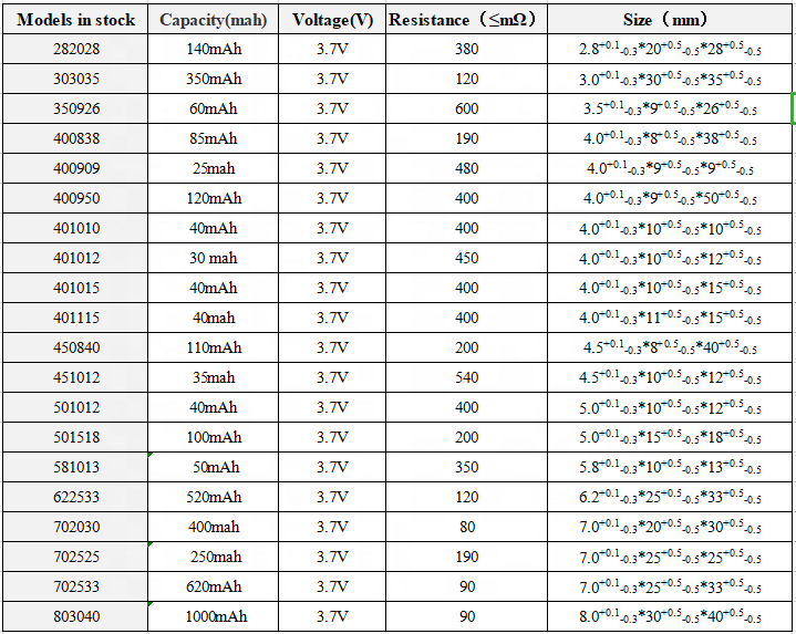ഉത്പന്നത്തിന്റെ പേര് | 581013 3.7 വി 50 എംഎഎച്ച് പോളിമർ ലിഥിയം ബാറ്ററി | പരാമർശിക്കുക | |